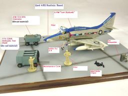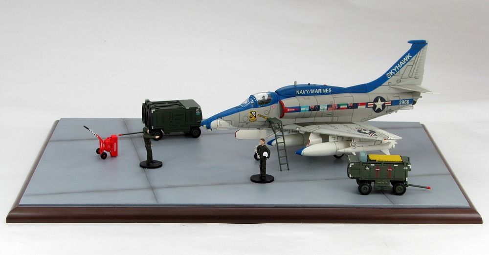 A-4M (A-4 from HA1401 “Last Skyhawk”). Accessories include - two die-cast service wagons, fire extinguisher on a dolly, two pilots - one standing, one sitting, one ground crew figure, ladder, wheel chocks.