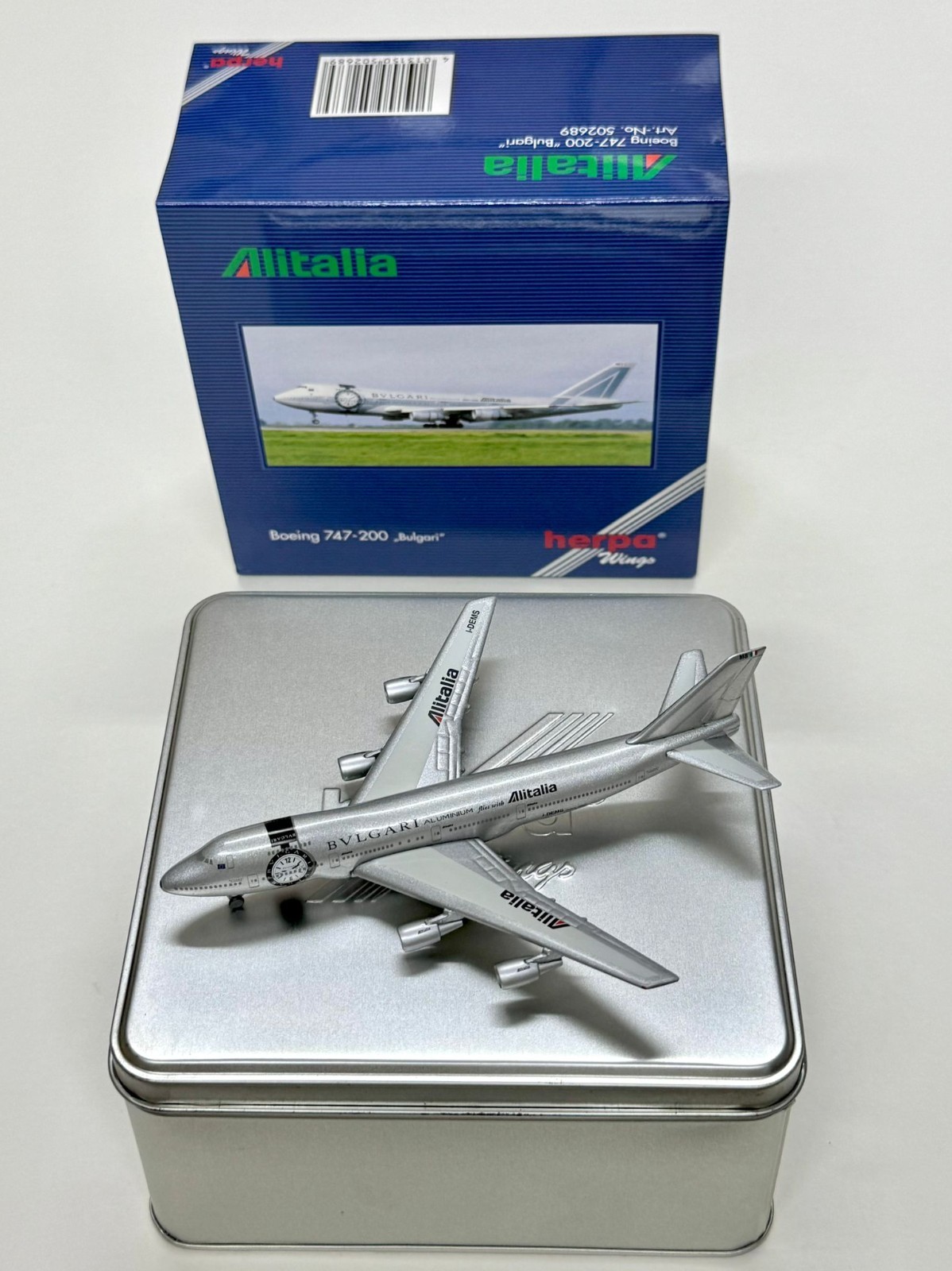 Herpa 502689 1:500 Diecast Airliner Alitalia Boeing 747-200 Bulgari metal box
