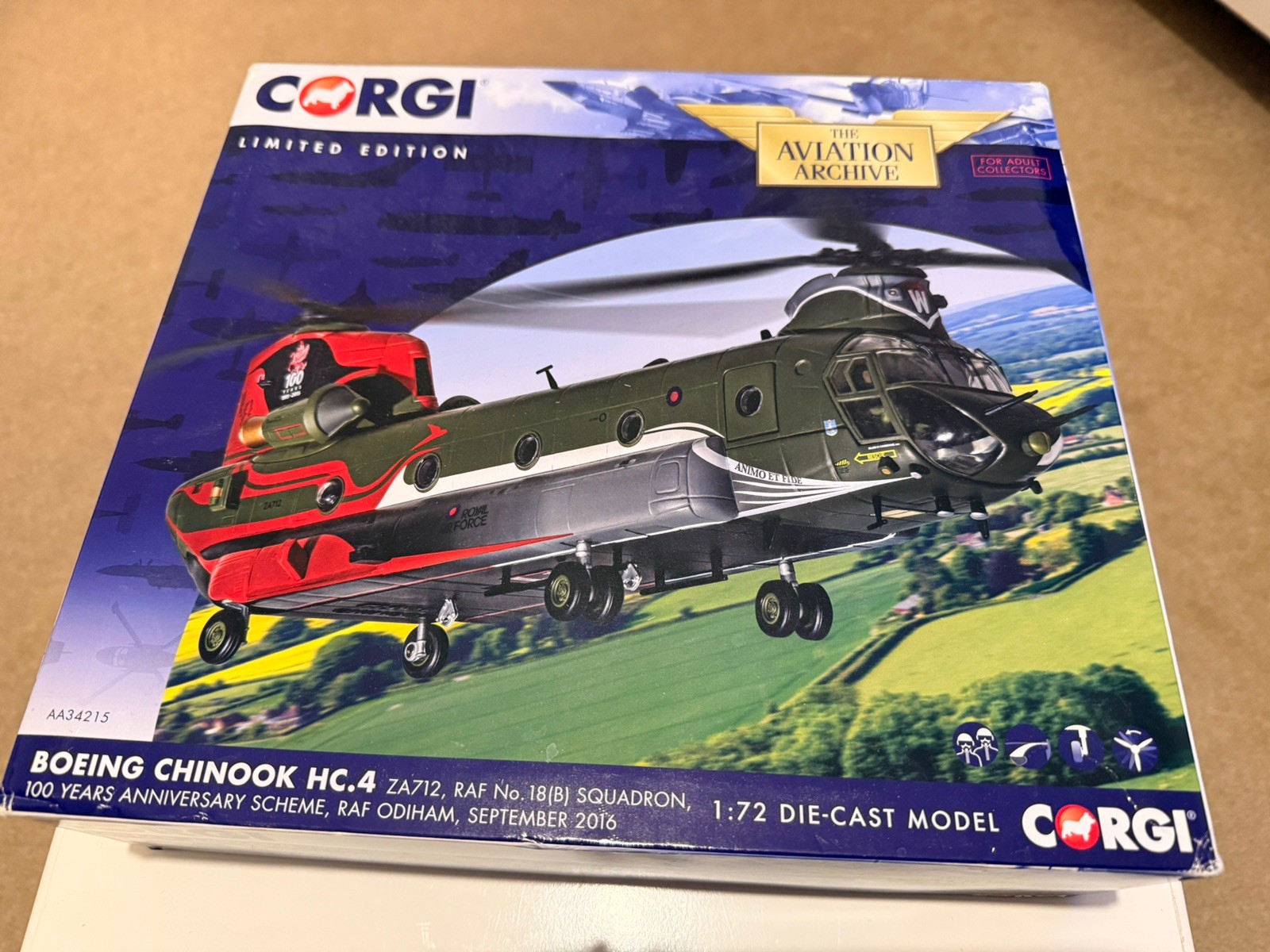 CORGI BOEING CHINOOK HC.4 RAF 18 (B) SQN 100 YRS RAF ODIHAM 2016 AA34215 1/72