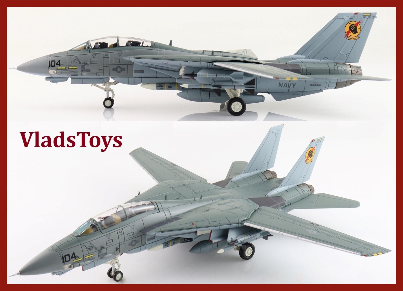 F-14A, As appeared in the Film “Top Gun”. Iceman/Slider's F-14. Fist of the fleet badge (VFA-213 “Black Lions” Squadron code). With decals for crew names.